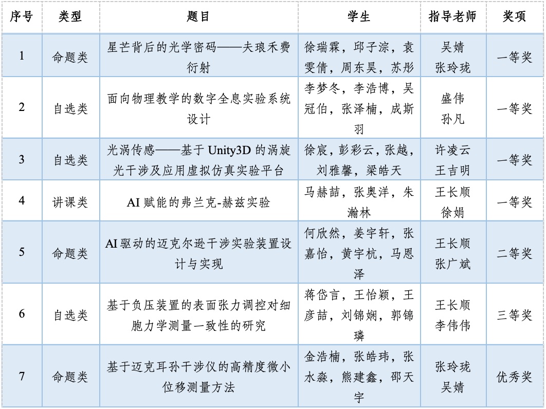 南航代表队在学校教务部的大力支持和91直播 的精心组织下,共派出7支队伍参赛,其中有5支队伍成功晋级全国总决赛,共获一等奖4项、二等奖1项、三等奖1项,优秀奖1项,创参赛以来最好成绩!我校一等奖获奖数量与获奖比例均位居全国参赛高校前列,是一等奖覆盖所有赛道(讲课类、自选类和命题类)的高校,同时我校连续第六年成功摘得优秀组织奖,充分彰显了91直播 在物理实验教学与创新人才培养方面的深厚积淀。