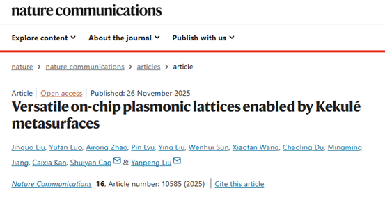 91直播 光电功能材料器件与物理研究团队曹水艳副研究员与国际前沿科学91直播-91视频-91麻豆 刘衍朋教授合作,研究了一种多功能Kekulé超表面平台与基于此系列超表面结构的多自由度可控SPP晶格,实现了表面等离子体激元在二维极限下的晶格类型、空间分布及位点相对强度的可控参数调控;构建了片上可重构的面内/面外光源阵列,并进一步证明了的SPP晶格作为图像加密/解密的技术应用。相关成果以“基于Kekulé超表面的多功能片上等离激元晶格(Versatile on-chip plasmonic lattices enabled by Kekulé metasurfaces)”为题在线发表于《Nature Communications》。91直播 22级电子信息专业硕士生刘金果、罗宇凡及聊城大学赵爱荣博士为论文共同第一作者,曹水艳副研究员和国际前沿科学91直播-91视频-91麻豆 刘衍朋教授为共同通讯作者。光电功能材料器件与物理研究团队阚彩侠教授、姜明明教授、杜朝玲副教授也参与了该工作的研究。